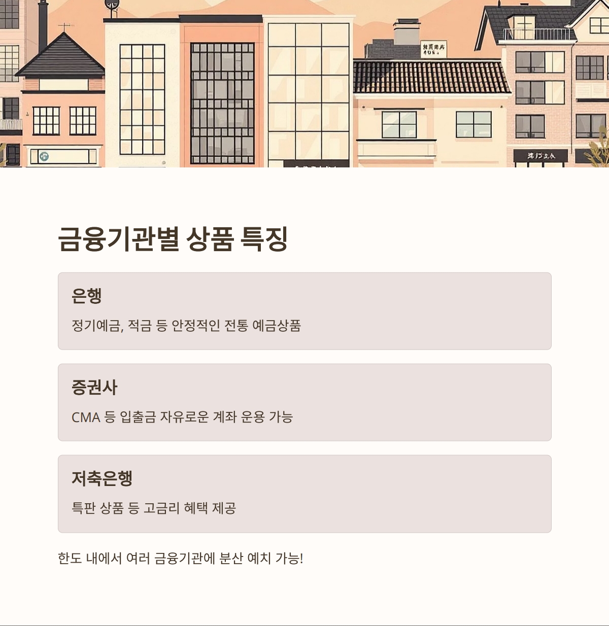 은행권에서는 정기예금, 적금 등 전통적 예금상품 가입이 쉽고 안정적인 반면, 증권사에서는 CMA 등 입·출금이 자유로운 계좌, 저축은행은 특판 상품 등 고금리 혜택을 제공하는 경우가 많아 목표와 자금 성격에 따라 최적의 상품을 선택할 수 있습니다.