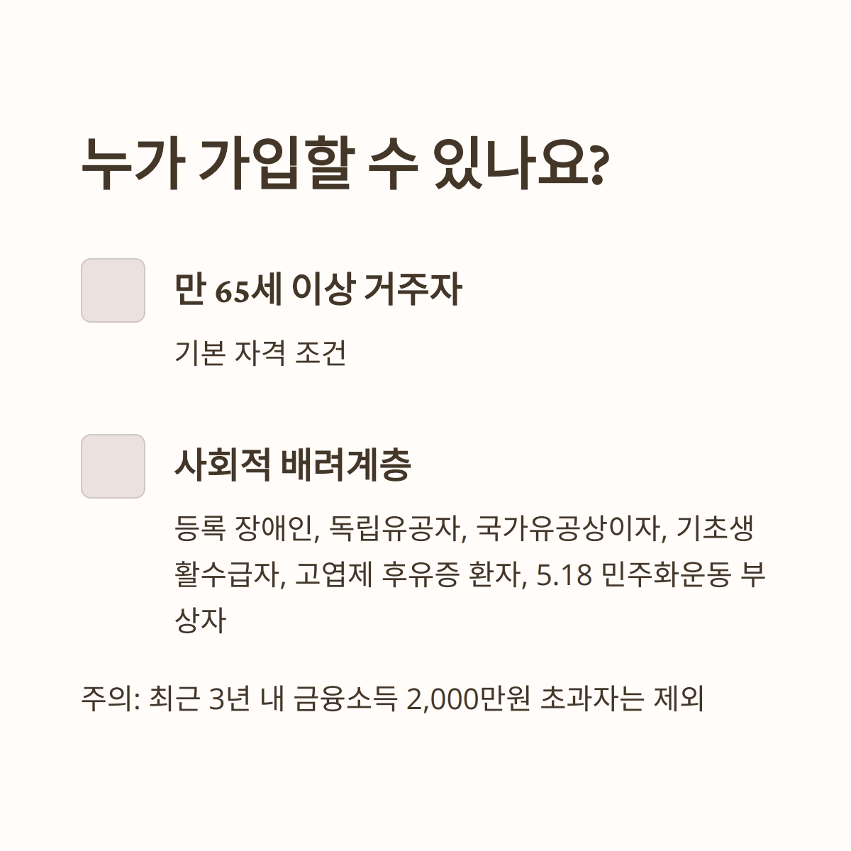 가장 기본적으로는 만 65세 이상인 거주자여야 하며, 이외에도 장애인복지법에 의거 등록된 장애인, 독립유공자 및 그 유족, 국가유공상이자, 국민기초생활보장법상 수급자, 고엽제 후유증 환자, 5.18 민주화운동 부상자 등 일정 조건을 충족하는 사회 취약계층이 대상입니다.