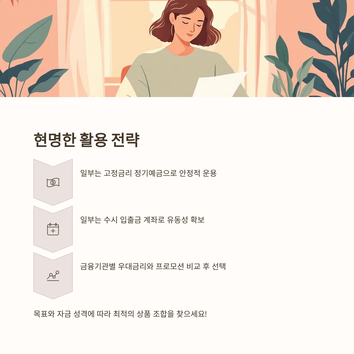 예를 들어 자금 일부는 고정금리 정기예금으로, 일부는 수시 입출금 계좌로 관리하면 유동성과 수익성을 모두 챙길 수 있습니다.