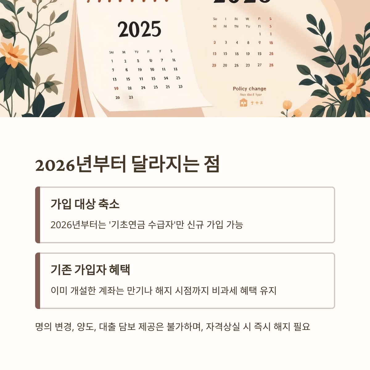 2025년 12월 31일까지만 신규 가입이 허용되며, 이후에는 ‘기초연금 수급자’만 신규 가입이 가능한 등 가입대상이 대폭 줄어듭니다.