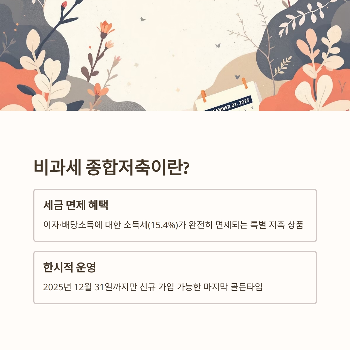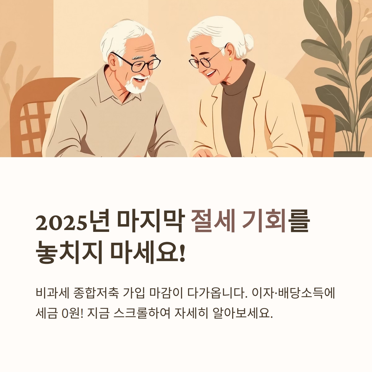 그 이유는 바로 ‘비과세 종합저축’이 2025년 12월 31일까지 한시적으로 신규 가입이 가능하기 때문입니다.