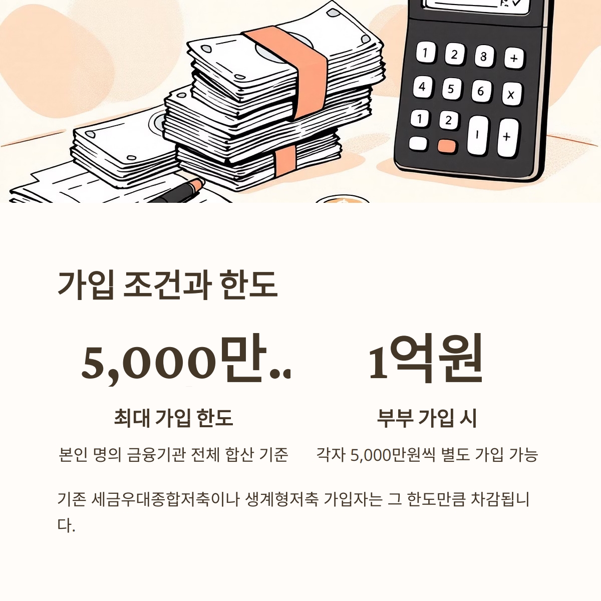 더불어 기존 세금우대종합저축이나 생계형저축에 이미 가입했다면, 그 한도만큼 비과세 종합저축 한도는 줄어듭니다.